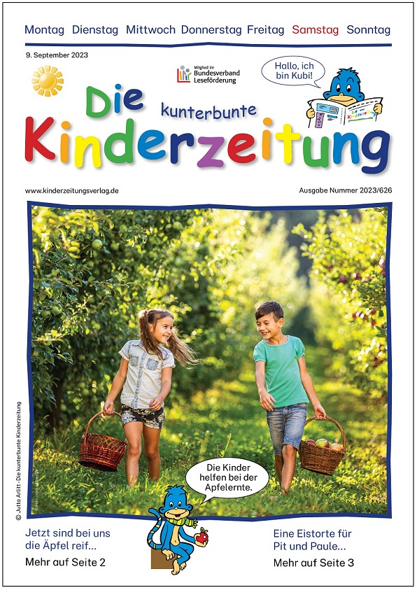 Die kunterbunte Kinderzeitung Ausgabe 2023-626, Jetzt sind die Äpfel reif zum Nachbestellen, inklusive Fragebogen Format: A4 Seiten: 5