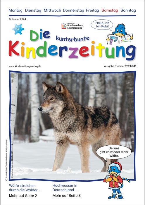 Die kunterbunte Kinderzeitung Ausgabe 2024-641, Wölfe streichen durch die Wälder zum Nachbestellen, inklusive Fragebogen Format: A4 Seiten: 5
