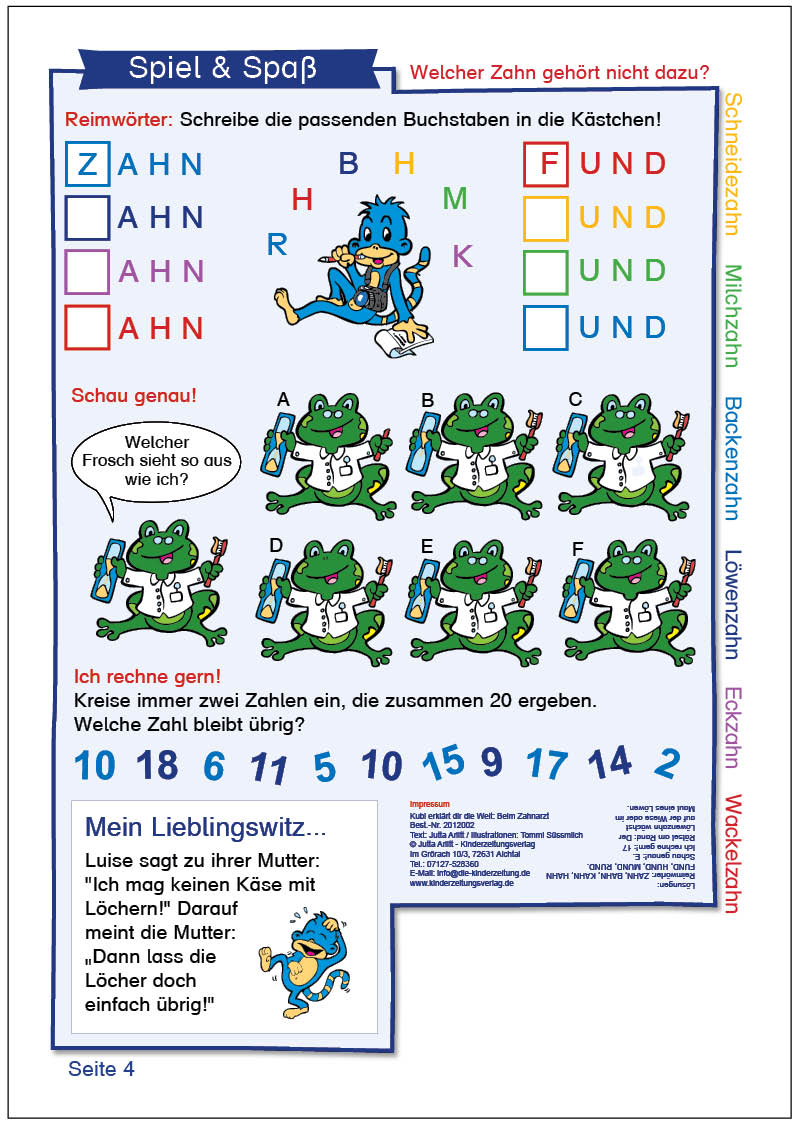 Wenn Sie die Ausgabe als Flyer in Ihrer Praxis auslegen oder verschenken möchten, können wir Ihre Adresse und Ihr Logo eindrucken und/oder ein Foto aus Ihrer Praxis einbinden. Für ein Angebot rufen Sie uns einfach an (07127-528360) oder senden Sie uns eine E-Mail (info@kinderzeitungsverlag.de).