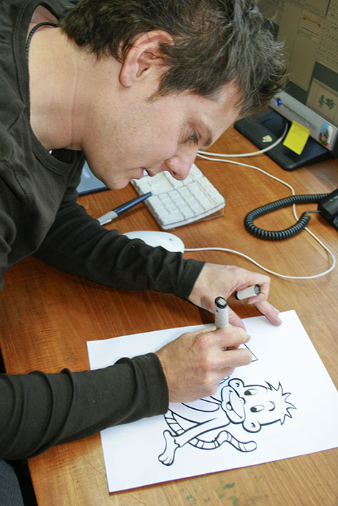 Tommi Süssmilch ist von Anfang an mit dabei und hat den kleinen Affen Kubi und den Wetterfrosch zum Leben erweckt. Er hat selbst ein Kind und arbeitet als Illustrator und Grafiker in verschiedenen Bereichen. Immer wieder zeichnet er neue Figuren, die Die kunterbunte Kinderzeitung noch bunter und lebendiger machen. |